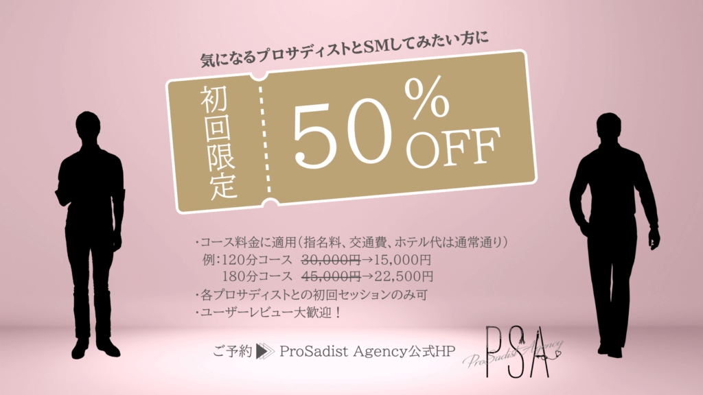初回限定でコース料金が50%offになるキャンペーンを実施いたします。是非この機会に、気になるプロサディストとのSMを楽しんでみてはいかがでしょうか。