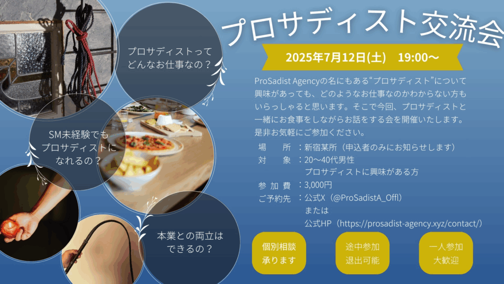 予約方法:公式XへDM(https://x.com/ProSadistA_Offl)または、公式HPから問合せ(https://prosadist-agency.xyz/contact/ 「その他お問合せ・ご連絡」を選択ください)